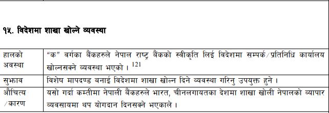 ०६९ साल यता केन्द्रीय बैंकले बैंकहरूले विदेशमा शाखा सञ्चालनको विषयमा कुनैपनि नीतिमा थप तथा संशोधन गरेको छैन। केन्द्रीय बैंकले एक दशक अघिदेखि बैंकहरूलाई विदेशमा शाखा सञ्चालनसँग सम्बन्धित कुनै पनि नीति लिएको छैन। यता, विगतदेखि विदेशमा शाखा सञ्चानल गर्न चाहेका बैंकहरू अन्योल मै छन्। आजभन्दा ४ वर्षअघि बैंक तथा वित्तीय संस्थाका सञ्चालकहरूको छाता संगठन बैंक तथा वित्तीय संस्था परिसंघ नेपाल (सीबीफीन) ले बैंक तथा वित्तीय संस्थालाई विदेशमा शाखा सञ्चालन गर्न पाउनुपर्ने विषय जोडतोडले उठान गरेको थियो।