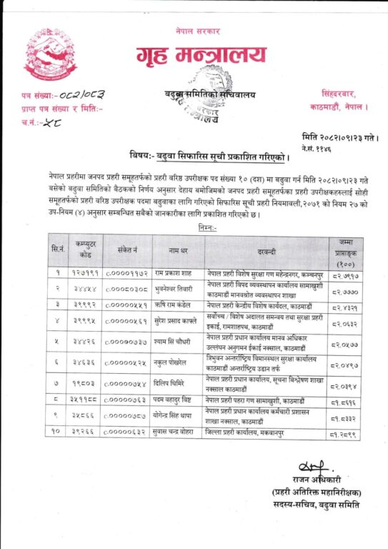 बढुवाको पहिलो नम्बरमा एसपी राम प्रकाश शाह रहेका छन्। साथै, दोस्रो नम्बरमा एसपी भुवनेश्वर तिवारी रहेका छन्। त्यसपछि क्रमश: एसपीहरु ऋषि राम कँडेल, सुरेश प्रसाद काफ्ले, श्यामसिं चौधरी, नकुल पोखरेल, दिलीप घिमिरे, पदम बहादुर विष्ट, योगेन्द्र सिंह थापा र सुवास चन्द्र बोहरा एसएसपीमा बढुवा सिफारिस भएका छन्।