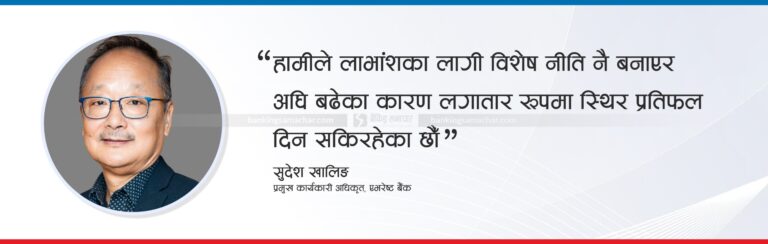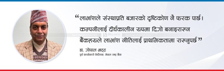 ’बैंकले दिने लाभांशले त्यस संस्थाप्रति बजारको दृष्टिकोण नै फरक पार्छ। कम्पनीलाई दीर्घकालीन रूपमा दिगो बनाइराख्न, शेयरधनीलाई आफ्नो लगानी सुरक्षित भएको अनुभूति दिलाउन र बजारमा विश्वास कायम राख्न बैंकहरूले लाभांश नीतिलाई रणनीतिक प्राथमिकता दिनैपर्ने देखिन्छ।