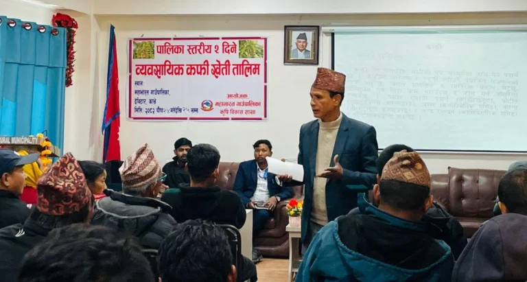 काठमाडौं – पुस काभ्रेपलाञ्चोकको डाँडापारिस्थित महाभारत गाउँपालिकाका कफीखेती गर्दै आएका किसानहरूलाई ‘व्यावसायिक कफीखेती प्रविधि तालिम’ प्रदान गरिएको छ। व्यावसायिक रूपमा ४०० देखि ५०० बढी विरुवा रोपेका किसानहरूका लागि पालिकाले सो तालिम प्रदान गरेको हो।