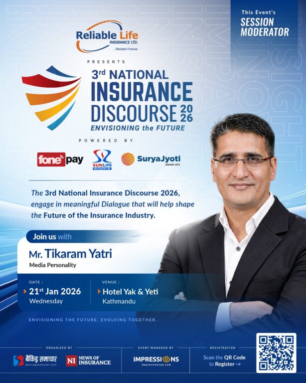 रिलायबल नेपाल लाइफ मुख्य प्रायोजक रहेको तेस्रो इन्स्योरेन्स डिस्कोर्श यही माघ ७ गते काठमाडौंको याक एण्ड यति होटलमा हुनेछ । यस्तै, पावर्ड वाइमा फोन पे, सन् नेपाल लाइफ र सुर्यज्योति लाइफ रहेको यस कार्यक्रममा नियामकीय निकाय, बीमा कम्पनीहरु, बैंक तथा वित्तीय क्षेत्र, बीमा विज्ञ तथा अन्य क्षेत्रका व्यक्तित्वहरुको उपस्थिति रहने छ।