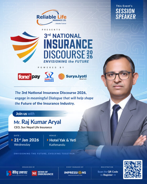 रिलायबल नेपाल लाइफ मुख्य प्रायोजक रहेको तेस्रो इन्स्योरेन्स डिस्कोर्श यही माघ ७ गते काठमाडौंको याक एण्ड यति होटलमा हुनेछ। यस्तै, डिस्कोर्शको पावर्ड वाइमा फोन पे, सन् नेपाल लाइफ र सुर्यज्योति लाइफ रहेको यस कार्यक्रममा नियामकीय निकाय, बीमा कम्पनीहरु, बैंक तथा वित्तीय क्षेत्र, बीमा विज्ञ तथा अन्य क्षेत्रका व्यक्तित्वहरुको उपस्थिति रहने छ।