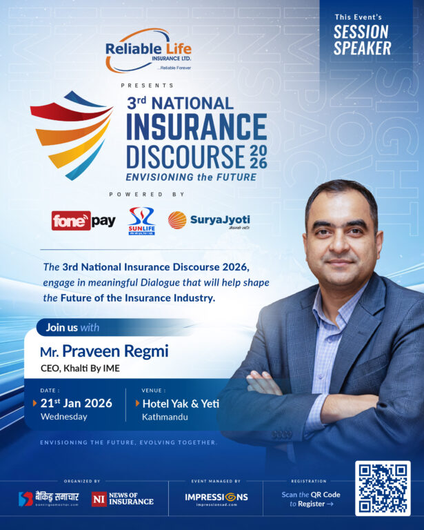 काठमाडौं – तेस्रो इन्स्योरेन्स डिस्कोर्श २०२६ को चौथो सत्रमा वक्ताका रुपमा खल्ती वाइ आईएमईका प्रमुख कार्यकारी अधिकृत (सीईओ) प्रविन रेग्मी सहभागी हुने भएका छन्। बैंकिङ्ग समाचार र न्युज अफ इन्स्योरेन्सको संयुक्त आयोजनामा हुन लागेको तेस्रो इन्स्योरेन्स डिस्कोर्शको ‘इन्सुरटेक नवप्रवर्तनः नेपालमा बीमालाई आवश्यकतासँगै जीवनशैलीमा परिणत गर्दै’ विषयक चौथो सत्रमा रेग्मी सहभागी हुने भएका हुन्।