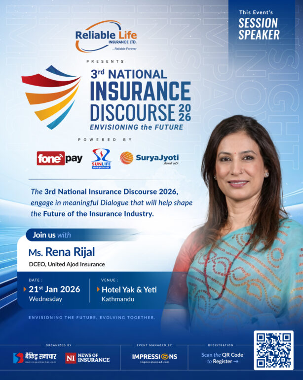 काठमाडौं – तेस्रो इन्स्योरेन्स डिस्कोर्श २०२६ को चौथो सत्रमा वक्ताका रुपमा युनाईटेड अजोड इन्स्योरेन्सकी डेपुटी प्रमुख कार्यकारी अधिकृत (डीसीईओ) रेना रिजाल सहभागी हुने भएकी छन्। बैंकिङ्ग समाचार र न्युज अफ इन्स्योरेन्सको संयुक्त आयोजनामा हुन लागेको तेस्रो इन्स्योरेन्स डिस्कोर्शको ‘इन्सुरटेक नवप्रवर्तनः नेपालमा बीमालाई आवश्यकतासँगै जीवनशैलीमा परिणत गर्दै’ विषयक चौथो सत्रमा खत्री सहभागी हुने भएकी हुन्।