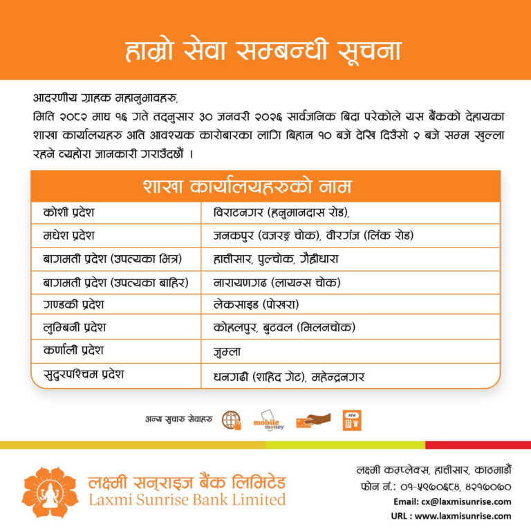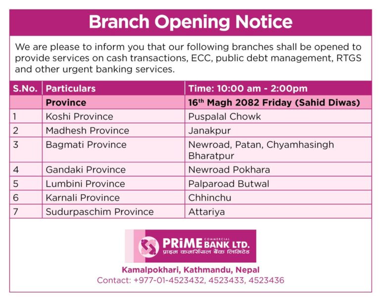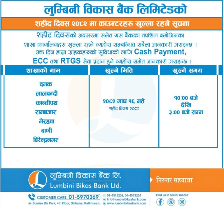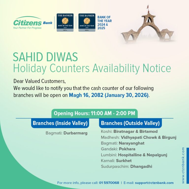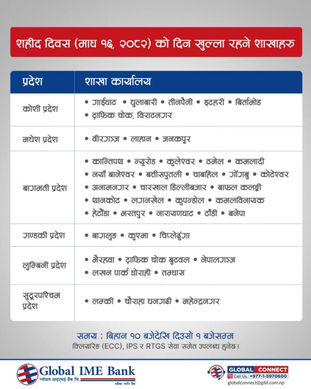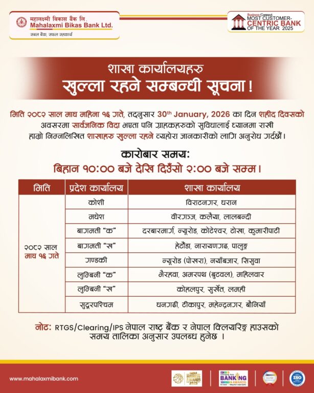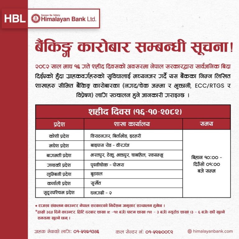 काठमाडौं – सरकारले आज शहिद दिवसकाे अवसरमा पारेर देशभर सार्वजनिक बिदा दिएको छ। वाणिज्य तथा विकास बैंकहरुले आफ्ना ग्राहकहरूको समस्यालाई मध्यनजर गर्दै बिदाका दिनमा समेत सीमित शाखा कार्यालयहरू सञ्चालन गरेर बैकिङ्ग सेवा दिइरहेका छन्।