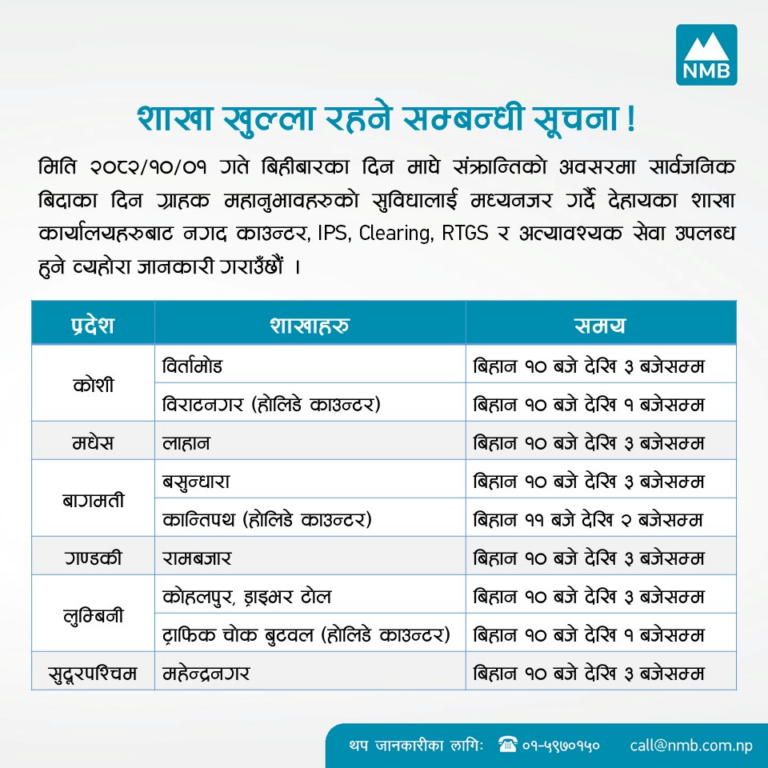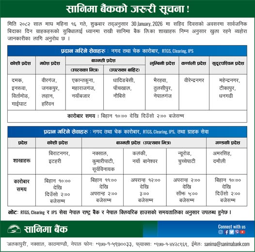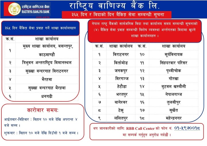 सार्वजनिक बिदाका दिन आज क्रमशः सानिमा बैंक, एनएमबि बैंक, सिटिजन्स बैंक, प्राइम कमर्सियल बैंक, हिमालयन बैंक, कामना सेवा विकास बैंक, एभरेष्ट बैंक, लक्ष्मी सनराइज बैंक, ग्लोबल आइएमई बैंक लगायतका बैंकहरुले केही शाखा कार्यालयबाट बैकिङ्ग सेवा प्रदान गरिरहेका छन् ।