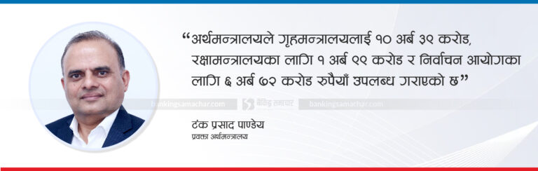 निर्वाचनका लागि सुरक्षा सम्बन्धी खर्च गर्ने जिम्मेवारी गृह मन्त्रालयको, नेपाली सेना परिचालन गर्ने जिम्मेवारी रक्षा मन्त्रालयको र निर्वाचन व्यवस्थापन गर्ने जिम्मेवारी निर्वाचन आयोगको हुन्छ। सोहीअनुसार अर्थमन्त्रालयले गृहमन्त्रालयलाई १० अर्ब ३९ करोड, रक्षामन्त्रालयका लागि १ अर्ब ९९ करोड र निर्वाचन आयोगका लागि ६ अर्ब ७२ करोड रुपैयाँ उपलब्ध गराएको प्रवक्ता पाण्डेयले जानकारी दिए।