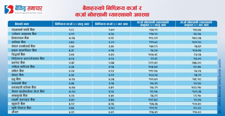 औसतमा हेर्दा बैंकहरूको निष्क्रिय कर्जा अनुपात ४.४८ प्रतिशतबाट बढेर ५.०७ प्रतिशत पुगेको छ। अर्थात् बैंकहरूले दिएको सय रुपैयाँ कर्जामध्ये करिब पाँच रुपैयाँ जोखिममा परेको अवस्था छ। सबैभन्दा कम निष्क्रिय कर्जा एभरेष्ट बैंकको देखिएको छ। एभरेष्ट बैंकमा निष्क्रिय कर्जा ०.६८ प्रतिशत मात्रै छ। यो अघिल्लो वर्ष पनि लगभग उस्तै (०.६६ प्रतिशत) थियो।