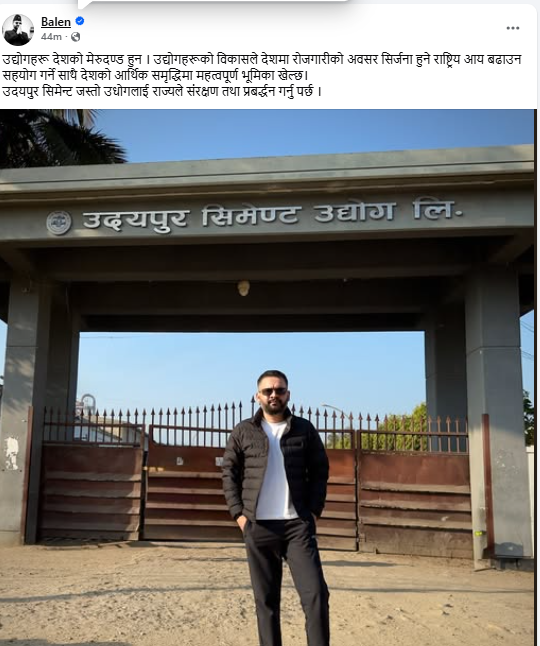 काठमाडौं – राष्ट्रिय स्वतन्त्र पार्टी (रास्वपा) का वरिष्ठ नेता बालेन्द्र (बालेन) शाहले उद्योगहरू देशको मेरुदण्ड रहेको बताएका छन्। नेता शाहले उदयपुर सिमेन्ट उद्योगको गेट अगाडि उभिएर खिचेको फोटो आफ्नो सामाजिक सञ्जालमा राख्दै उद्योगहरुको विकासले देशमा रोजगारीको अवसर सिर्जना हुने उल्लेख गरेका हुन्।