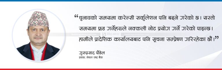 ‘चुनावको समयमा करेन्सी सर्कुलेशन पनि बढ्ने गरेको छ, यस्तो समयमा फ्रड गर्नेहरुले नक्कली नोट प्रयोग गर्ने गरेको पाइन्छ’ उनले बैंकिङ्ग समाचारसँग भने, ‘केन्द्रीय बैंकको प्रादेशिक कार्यालयबाट पनि सूचना सम्प्रेषण गरिरहेका छौं।’ प्रवक्ता पौडेलकाअनुसार अहिले यसको नियमनका लागी ठोस काम गर्न सक्ने अवस्था नहुँदा प्रहरीसँग पनि केन्द्रीय बैंकले समन्वय गरिरहेको छ। उनले एउटा नक्कली नोटले नै पनि ठूलो जालोमा पुर्याइदिने भएकाले नक्कली नोट प्रयोग गरेको पाइएमा तत्काल प्रहरी, नेपाल राष्ट्र बैंक र बैंक तथा वित्तीय संस्थामा सम्पर्क गर्नुपर्ने बताए।