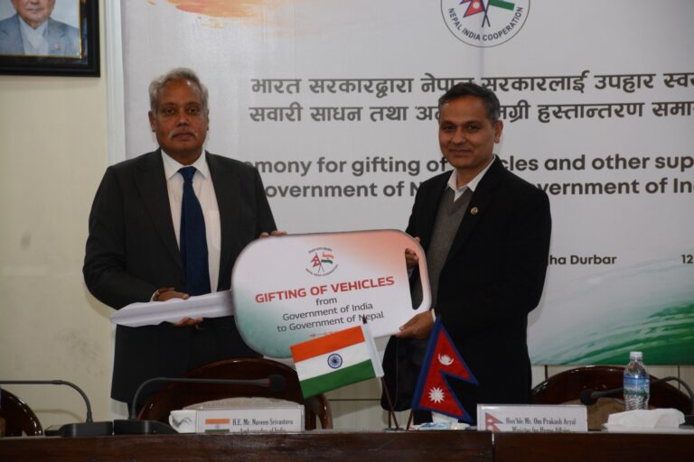 काठमाडौं – भारत सरकारले आगामी प्रतिनिधिसभा सदस्य निर्वाचनका लागि सहयोग स्वरुप तेस्रो चरणमा २२३ वटा हस्तान्तरण गरेको छ। गृह मन्त्रालयमा आज आयोजित कार्यक्रममा गृहमन्त्री ओमप्रकाश अर्याललाई नेपालका लागि भारतका राजदूत नवीन श्रीवास्तवले प्रतिकात्मकरुपमा ती सवारी साधन हस्तान्तण गरे।