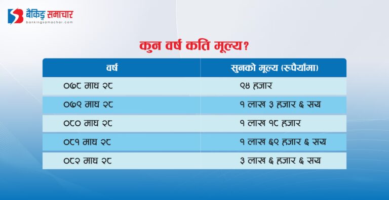 नेपाली बजारमा पछिल्लो पाँच वर्षमा सुनको मूल्य करिब तेब्बरले बढेर ३ लाख रुपैयाँ भन्दा माथि पुगेको छ। ०७८ माघ २८ सम्ममा प्रतितोला ९४ हजार रुपैयाँ भएको सुनको मूल्य २०८२ को माघ २८ गते १ लाख ३ हजारु रुपैयाँ पुगेको थियो। त्यस्तै, २०८१ माघ २८ गते सुनको मूल्य प्रतितोला १ लाख ६९ हजार रुपैयाँ रहेकोमा २०८२ को सोही दिन सुन साढे २ लाख रुपैयाँले बढेर ३ लाख ६ हजार ६ सय रुपैयाँ पुगेको छ।