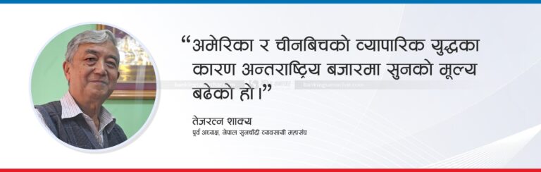 नेपाल सुनचाँदी व्यवसायी महासंघका पूर्व अध्यक्ष तेजरत्न शाक्यले अमेरिका र चीनबिचको व्यापारिक युद्धका कारण अन्तराष्ट्रिय बजारमा सुनको मूल्य बढेको बताए। उनले भने, ‘अहिले अन्तर्राष्ट्रिय बजारमा आएको उथलपुथलले एउटा दीर्घकालीन रुपमा लगानी गर्ने क्षेत्र छैन भन्ने सन्देश दिएको छ। व्यापार व्यवसाय अहिले राम्रो छैन। अर्थतन्त्रको अहम भूमिका खेल्ने शेयर मार्केटको अवस्था पनि राम्रो छैन। जसले गर्दा लगानीकर्ताहरूले दीर्घकालीन लगानीको क्षेत्र खोजी गर्न थाले। अन्य क्षेत्र भरपर्दाे नदेखेपछि सुनतिर नै लगानी गर्न थाले।’