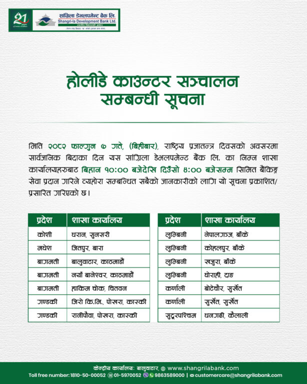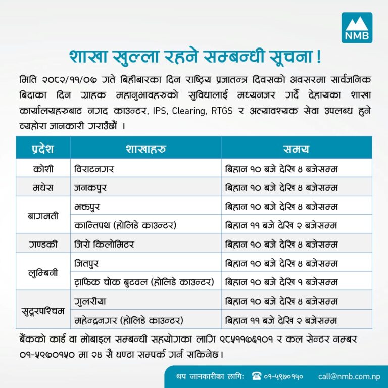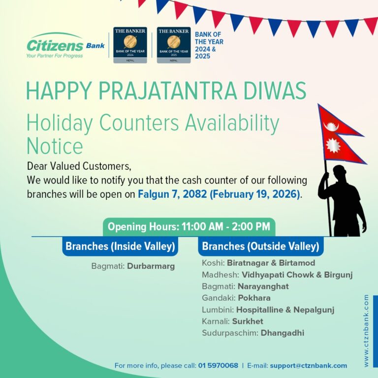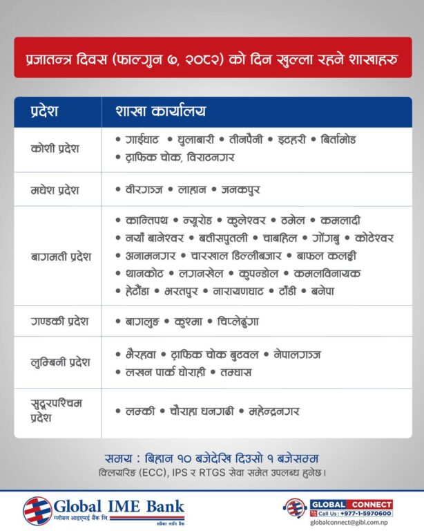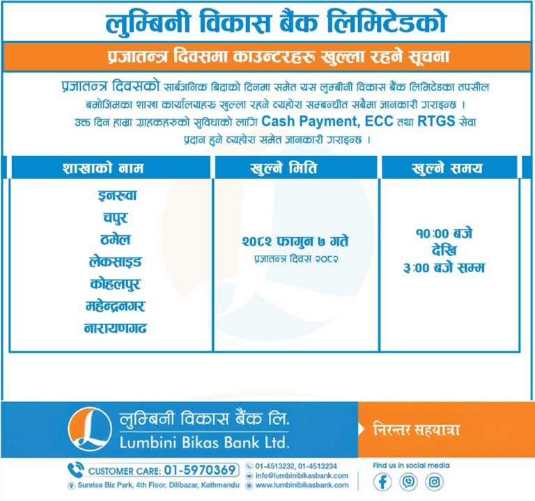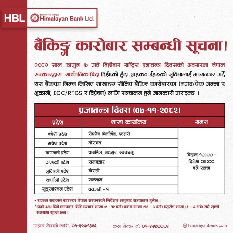 काठमाडौं – आज प्रजातन्त्र दिवस देशभर विभिन्न कार्यक्रम आयोजना गरी मनाइँदैछ। यस अवसरमा सरकारले देशभर सार्वजनिक बिदा दिएको छ। बिदाका कारण अधिकांश सरकारी निकाय तथा औपचारिक क्षेत्रका संस्थाहरू बन्द छन्।