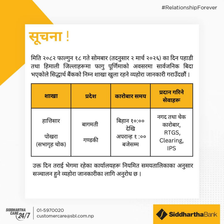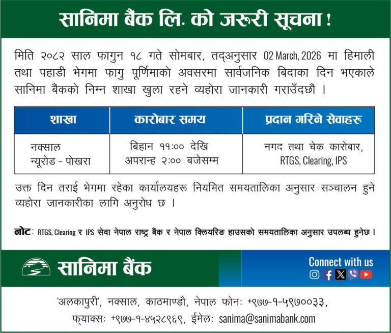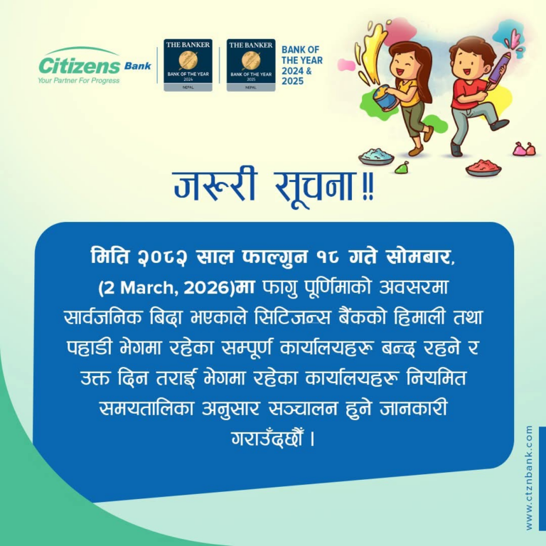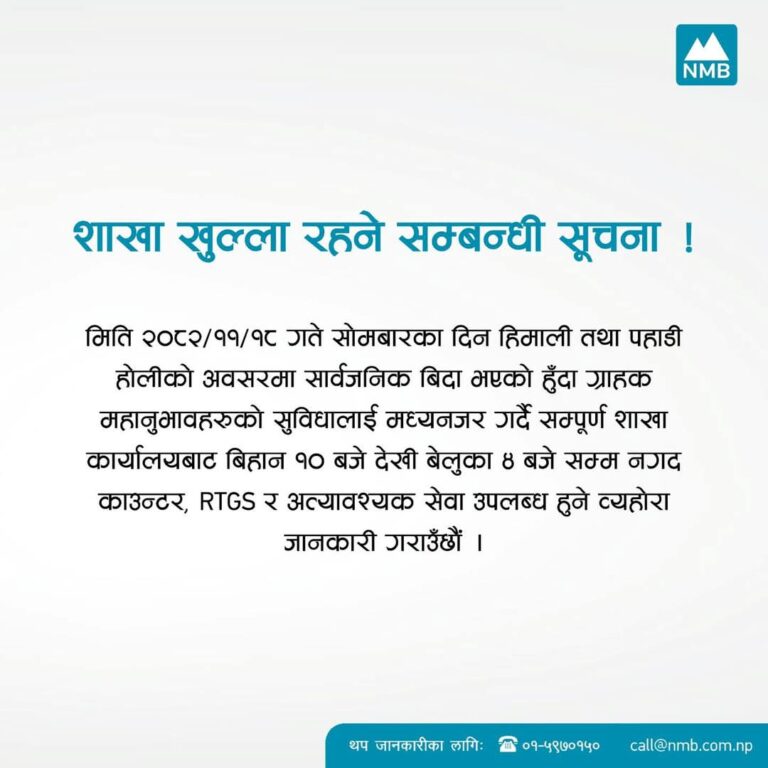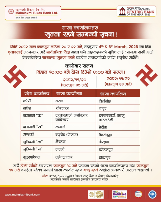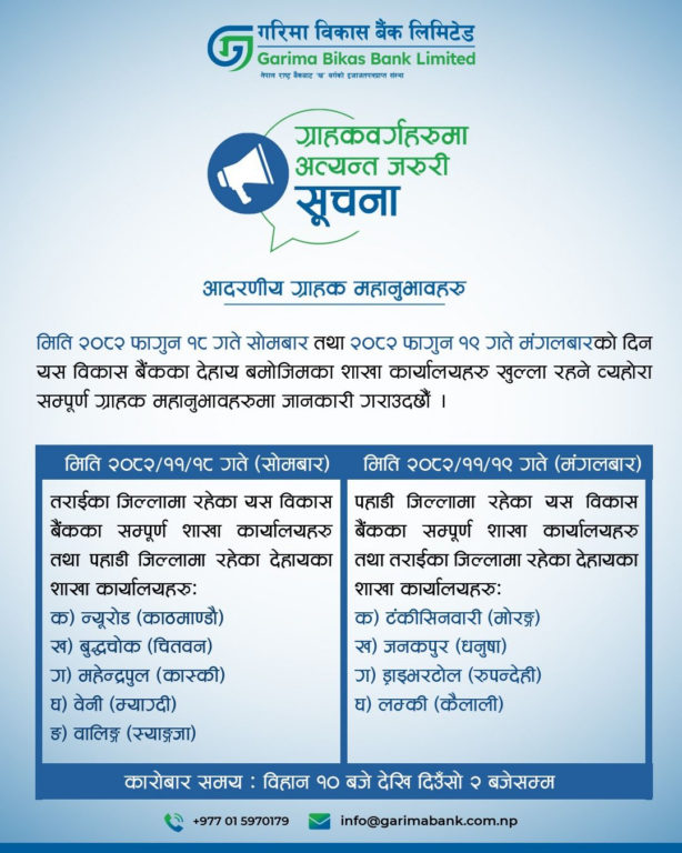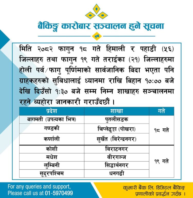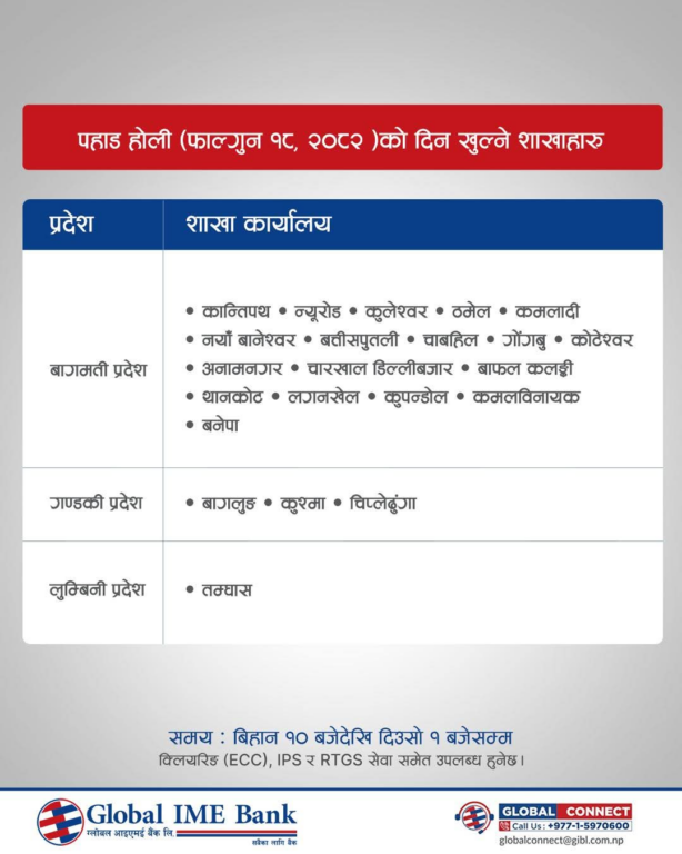 वाणिज्य बैंक तथा विकास बैंकहरूले आफ्ना सेवाग्राहीको आवश्यकतालाई मध्यनजर गर्दै वालीको बिदाको दिन समेत बैंकिङ्ग सेवा दिने भएका हुन्। बैंकहरुले होलिडे काउन्टरमार्फत निक्षेप संकलन र भुक्तानी, विदेशी मुद्रा विनिमय लगायतका सुविधा दिनेछन्।