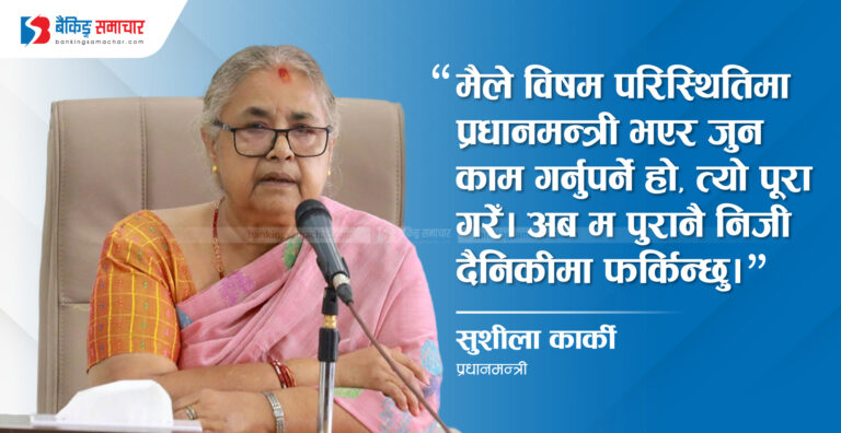 एक/दुई जनाले त ‘यसलाई असफल बनाएर आफैँ प्रधानमन्त्री बन्छु’ पनि भने। राजनीतिक दलको भनाइ चाहिँ तपाईं प्रधानमन्त्री भए पनि राजनीतिक दलको मन्त्री राखेर सरकार चलाउनु भन्ने पनि आएको थियो। यो देशमा प्रधानमन्त्री सबैभन्दा ठूलो कुरा हुने रैछ। मेरा लागि त त्यस्तो अमूल्य छैन। म अहिले पनि प्रधानन्यायाधीश भन्न नै मनपर्छ। न्याय क्षेत्रकै सङ्गत मनपर्छ। तर मानिसलाई प्रधानमन्त्रीमा आकर्षण हुने रैछ। ‘त्यो सुशीलाले सक्ने, हामीले नसक्ने ?’ पनि भने। अपशब्द पनि बोले। यस्तो कपडा लगाएको, चुरा यस्तो लगाएको, बाङ्गो भएर हिँडेको भन्ने जति त सबै भने। जति आलोचना गरून्, मलाई केही फरक पर्दैन। आफ्नो नजर हो।