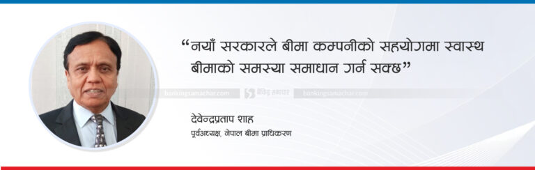 नेपाल बीमा प्राधिकरणका पूर्व अध्यक्ष देवेन्द्रप्रताप शाह बीमा प्राधिकरण र बीमा कम्पनीलाई अघि बढाउने जिम्मेवारी दिए स्वास्थ बीमाको समस्या समाधान हुने बताउँछन्। बीमा गरेका सबैलाई भुक्तानी दिँदा अहिले स्वास्थ बीमा संकटमा परेको उनको भनाइ छ। उनले दावी परेपछि भुक्तानी गर्ने व्यवस्था गरे नयाँ सरकारले बीमा कम्पनीको सहयोगमा स्वास्थ बीमाको समस्या समाधान गर्नसक्ने बताए। ‘धेरैसँग प्रिमियम उठाएर क्लेम परेकाहरूलाई मात्रै भुक्तानी गर्ने गर्नुपर्छ,’ उनले भने, ‘अहिलेको अवस्थामा सरकारले चाह्यो भने सहजै यसको समाधान गर्न सक्छ।’