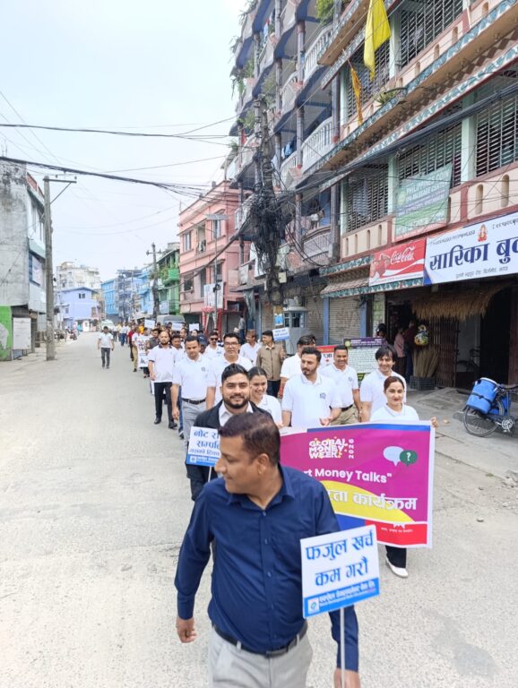 काठमाडौं– नेपाल राष्ट्र बैंकको आह्वानमा विश्वव्यापी रूपमा मनाइदै आएको ग्लोबल मनी विक २०२६ को अवसरमा ‘स्मार्ट मनि टल्क्स’ भन्ने मूल नारासहित सोमबार बिर्तामोडमा वित्तीय साक्षरता सम्बन्धी प्रभातफेरी कार्यक्रम सम्पन्न गरिएको छ। उक्त कार्यक्रममा बिर्तामोडमा अवस्थित विभिन्न बैंक तथा वित्तीय संस्थाहरूका झण्डै २५० जना कर्मचारीहरुको सहभागिता थियो।