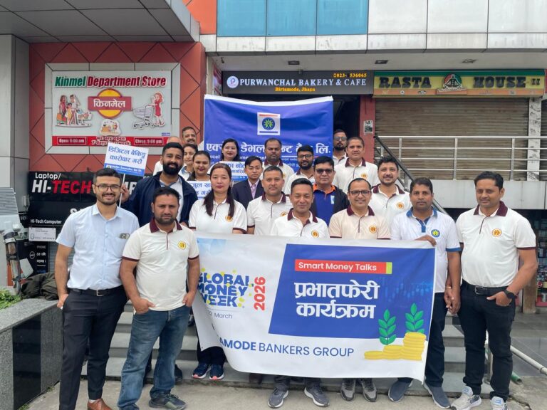 काठमाडौं– नेपाल राष्ट्र बैंकको आह्वानमा विश्वव्यापी रूपमा मनाइदै आएको ग्लोबल मनी विक २०२६ को अवसरमा ‘स्मार्ट मनि टल्क्स’ भन्ने मूल नारासहित सोमबार बिर्तामोडमा वित्तीय साक्षरता सम्बन्धी प्रभातफेरी कार्यक्रम सम्पन्न गरिएको छ। उक्त कार्यक्रममा बिर्तामोडमा अवस्थित विभिन्न बैंक तथा वित्तीय संस्थाहरूका झण्डै २५० जना कर्मचारीहरुको सहभागिता थियो।