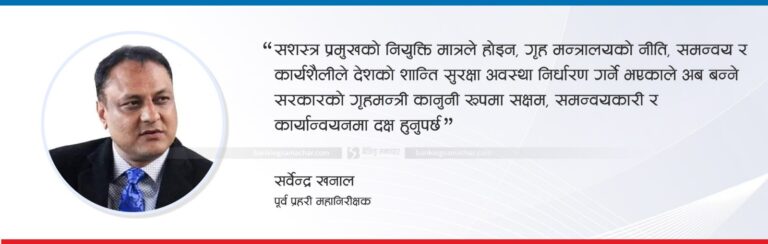 गृह मन्त्रालय अन्तर्गत नेपाल प्रहरी र सशस्त्र प्रहरी बल दुवै सुरक्षा निकाय सञ्चालन हुने भएकाले सशस्त्रका प्रमुख नियुक्तिलाई विशेष रूपमा हेरिने सरोकारवालाहरू बताउँछन्। गृह मन्त्रालय र सुरक्षा निकायबीच स्पष्ट कार्ययोजना र विश्वासको वातावरण निर्माण भए शान्ति सुरक्षामा सुधार आउन सक्छ। तर, राजनीतिक हस्तक्षेप बढेमा निर्णय प्रक्रिया कमजोर हुने जोखिम पनि रहन्छ। सशस्त्र प्रमुखको नियुक्ति मात्रले होइन, गृह मन्त्रालयको नीति, समन्वय र कार्यशैलीले देशको शान्ति सुरक्षा अवस्था निर्धारण गर्ने भएकाले अब बन्ने सरकारको गृहमन्त्री कानुनी रूपमा सक्षम, समन्वयकारी र कार्यान्वयनमा दक्ष हुनुपर्ने पूर्व प्रहरी महानिरीक्षक सर्वेन्द्र खनाल बताउँछन्।