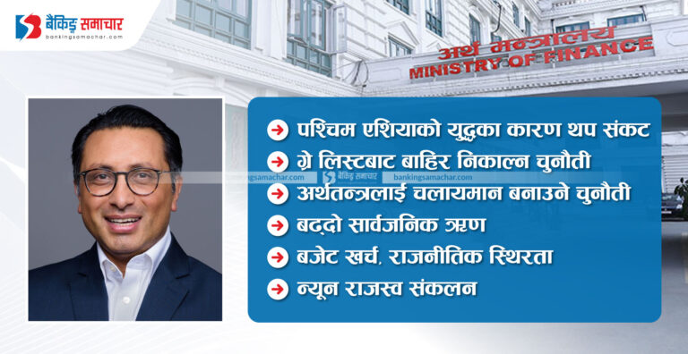 यतिबेला पश्चिम एसियाको युद्धले नेपाली अर्थतन्त्रलाई थप संकटमा पार्ने जोखिम बढिरहेको छ। नेपाल जस्तो रेमिट्यान्समा निर्भर देशका लागि यो निकै चुनौतीपूर्ण बन्ने देखिन्छ। यस युद्धले ४५ प्रतिशतसम्म रेमिट्यान्स आप्रवाहमा प्रत्यक्ष असर पार्ने देखिएको हो । साउदी, युएई, कतार, कुवेत लगायत देशहरूबाट करिब ६५ प्रतिशत रेमिट्यान्ट आउने गरेको तथ्यांकहरुमा उल्लेख छ । तर, युद्धका कारण नयाँ श्रम स्वीकृति रोकिदाँ, कामदारहरूको जागिर गुम्दा रेमिट्यान्स प्रत्यक्ष प्रभावित बन्ने देखिएको हो। युद्धका कारण स्ट्रेट अफ होर्मुज जस्ता महत्त्वपूर्ण मार्ग प्रभावित हुँदा तेल आपूर्ति कठिन बनेको छ। यस्तो समयमा अर्थमन्त्रालयको बागडोर सम्हालेका अर्थमन्त्री वाग्लेलाई बढ्दो संकट कम गर्न चुनौती रहेको छ।