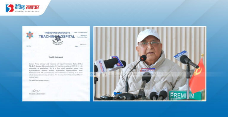 त्रिभुवन विश्वविद्यालय शिक्षण अस्पतालले अध्यक्ष ओलीको स्वास्थ्यस्थितिबारे केही बेरअघि एक विज्ञप्ति जारी गर्दै उनी चिकित्सकको अवलोकन एवं निगरानीमा रहकाे जनाएको छ।