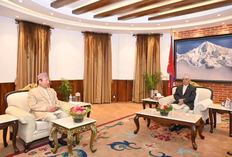 काठमाडाैं – राष्ट्रपति रामचन्द्र पौडेलसँग प्रधानन्यायाधीश प्रकाशमान सिंह राउतले आज भेट गरेका छन्। शीलत निवासस्थित राष्ट्रपति भवनमा राष्ट्रपति पौडेलसँग आफ्नो पदावधि सकिन लागेका अवस्थामा प्रधानन्यायाधीश राउतले भेट गरेका छन्।