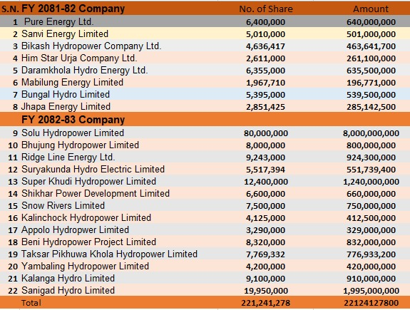 त्यसैगरी आव २०८२/८३ मा १४ कम्पनीको १८ अर्ब ६० करोड १४ लाख ७२ हजार ६०० रुपैयाँ बराबरको १८ करोड ६० लाख १४ हजार ७२६ कित्ता संस्थापक शेयर नेप्सेमा सूचीकृत हुन बाँकी रहेको छ। २२ कम्पनीको कुल २२ अर्ब १२ करोड ४१ लाख २७ हजार ८०० रुपैयाँ बराबरको २२ करोड १२ लाख ७१ हजार २७८ कित्ता संस्थापक शेयर नेप्सेमा सूचीकृत हुन बाँकी छ।