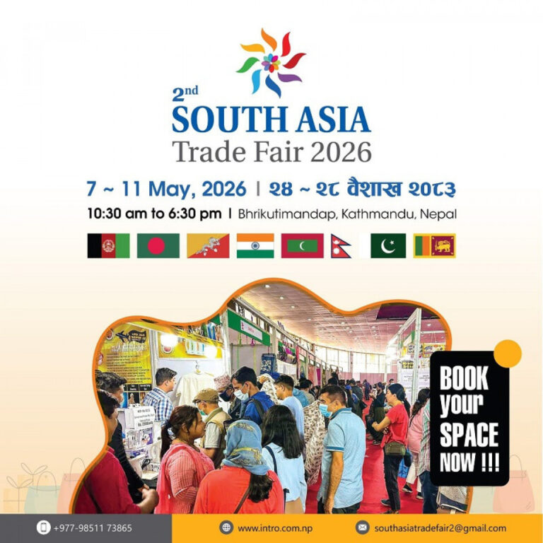 काठमाडौं- दक्षिण एसिया क्षेत्रका उद्योग, व्यापार तथा सेवासम्बन्धी अवसरहरूलाई एकै थलोमा ल्याउने उद्देश्यसहित ‘साउथ एसिया ट्रेड फेयर २०२६’ आगामी ७ देखि ११ मे २०२६ (वैशाख २४ देखि २८ २०८३) सम्म काठमाण्डौमा आयोजना हुने भएको छ। मेला भृकुटीमण्डपस्थित प्रदर्शनी हलमा सञ्चालन हुनेछ।