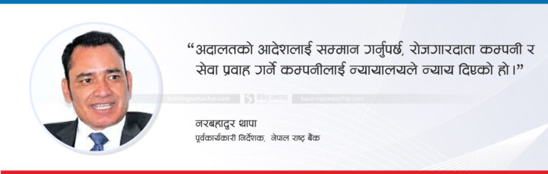 राष्ट्र बैंकका पूर्वकार्यकारी निर्देशक नरबहादुर थापा भने अदालतको आदेश मान्नुको विकल्प नभएको बताउँछन्। उनले अदालतले नै जारी गरेको आदेशलाई आधार मानेर बैंक तथा वित्तीय संस्थाले कर्जा लगानी गर्नुपर्ने बताए। ‘लगानी नपाएर रोकिएको व्यवसायबाट आर्जन गरेर कर्जाको सावाँ तथा ब्याज भुक्तानी गर्ने अवस्था आउँछ,’ उनले बैंकिङ्ग समाचारसँग भने, ‘अदालतको आदेशलाई सम्मान गर्नुपर्छ, रोजगारदाता कम्पनी र सेवा प्रवाह गर्ने कम्पनीलाई न्यायालयले न्याय दिएको हो।’