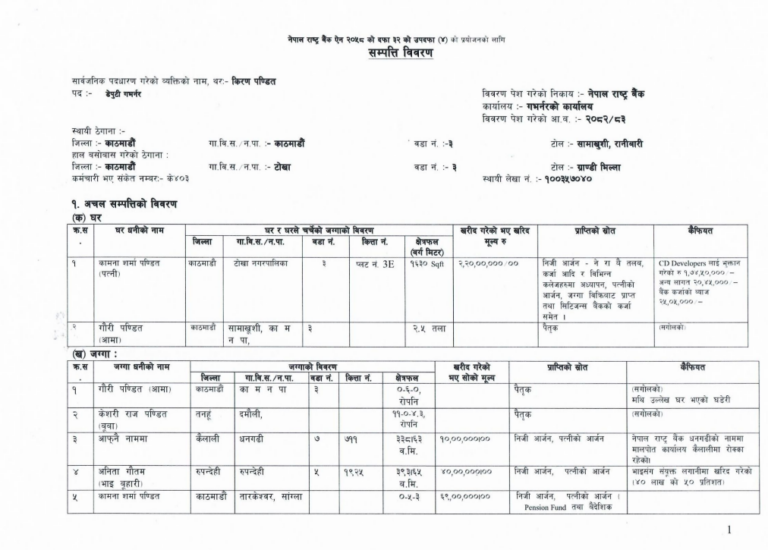 काठमाडौं – नेपाल राष्ट्र बैंकका डेपुटी गभर्नर किरण पण्डितले आफ्नो सम्पत्ति विवरण सार्वजनिक गरेका छन्। राष्ट्र बैंकले सार्वजनिक गरेको विवरण अनुसार पण्डित तथा उनका परिवारका नाममा विभिन्न स्थानमा जग्गा, सुनचाँदी र बैंक मौज्दात रहेको देखिएको छ।