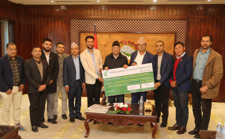 जाजरकोट र रुकुम पश्चिममा भूकम्पबाट पीडित तथा प्रभावितहरुको उद्धार एवम् राहतका लागि ट्रेकिङ एजेन्सी एसोसिएसन अफ नेपाल टान ले रु पाँच लाख ५ हजार ५ सय ५५ हस्तान्तरण गरेको छ ।
