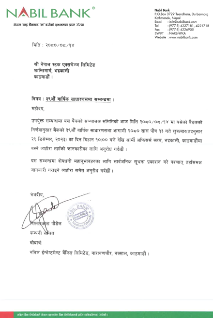 नविल बैंक सञ्चालक समितिको आज बसेको निर्णयले सभा पुष १३ गते वार्षिक साधारण सभा आह्वान गरेको हो । बैंकले आफ्नो ३९औं वार्षिक साधारण सभा आह्वान गरेको छ ।