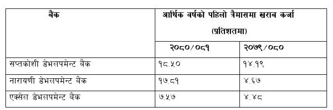 सम्बन्धित बैंक स्वयंले सार्वजनिक गरेको चालु आर्थिक वर्षको पहिलो त्रैमासिक अपरिष्कृत वित्तीय विवरणलाई हेर्दा पनि यी बैंकहरूमा न्यूनतम् सातदेखि १८ प्रतिशतसम्म कर्जा खराब देखिएको छ। गत आवको सोही अवधिमा यी बैंकहरुको यस्तो कर्जाको अनुपात चारदेखि १४ प्रतिशतसम्म रहेको थियो।