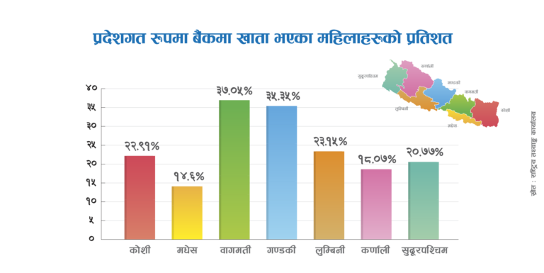 यसमा कुल जनसंख्याको २५.५६ प्रतिशत मानिसको बैंक खाता छ। जसमा महिलाको संख्या २४.७४ प्रतिशत मात्र छ। पुरुषको भने २६.४२ प्रतिशत बैंक खाता रहेको छ। प्रदेशगत रुपमा महिलाहरुको बैंक खाता संख्या हेर्ने हो भने कोशी प्रदेशमा २२.९१ प्रतिशत, मधेशमा १४.६० प्रतिशत, बागमती प्रदेशमा ३७.०५ प्रतिशत, गण्डकीमा ३५.३५ प्रतिशत, लुम्बिनीमा २३.१५ प्रतिशत, कर्णालीमा १८.०७ प्रतिशत र सुदरपश्चिम प्रदेशमा २०.७७ प्रतिशत रहेको छ।