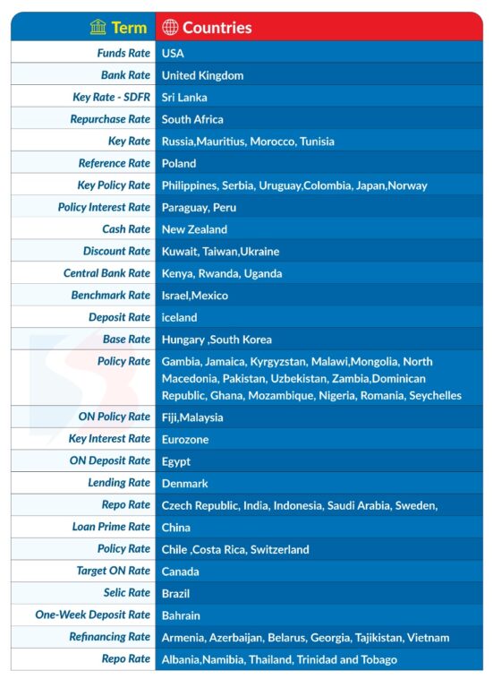 पोलिसी रेट’ विश्वमा नामले प्रयोग हुन्छ। देशअनुसार यस्ताे छ केन्द्रीय बैंकहरूले प्रयाेग गर्ने शब्द :