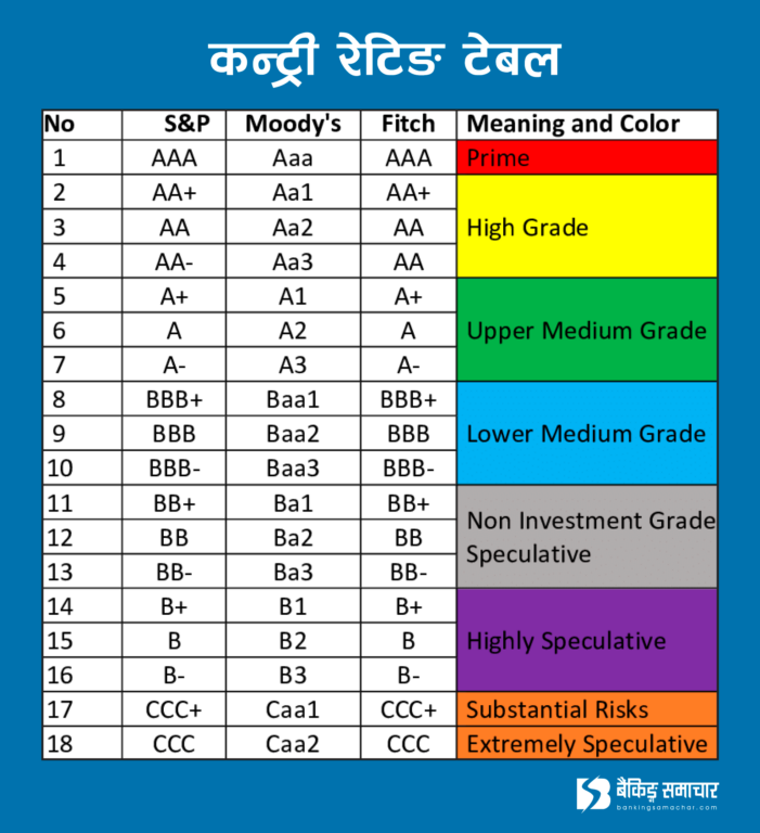 यसमध्ये बीबीबी माइनसदेखि माथिको रेटिङलाई लगानीका लागि राम्रो र बी माइनससम्मको रेटिङलाई भने उच्च जोखिम मानिन्छ । अर्थात् जति खराब रेटिङ हुँदै गयो, त्यस्तो मुलुकले ऋण फिर्ता गर्न नसक्ने जोखिम बढी हुने वा लगानीको वातावरण खराब हुने ठहर्छ ।