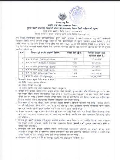 राष्ट्र बैंकले कुल ६३ लाख २९ हजार रुपैयाँ (मू.अ.करसहित) ती गाडी बेच्नेछ। गाडी खरिद गर्न इच्छुकले माघ २२ गते दिउँसो १ बजेसम्म बोलपत्र पेस गर्नुपर्नेछ।