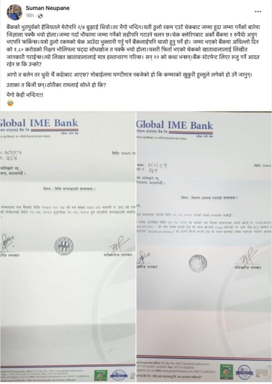 न्यौपानेले बैंकका भुतपूर्वको हैसियतले मेरोपनि २्४ वटा बुझाई थियो, तर भैगो भन्दिन भन्दै स्टाटसको सुरुवात गरेका छन् । यस्तो छ, उनको आधिकारिक फेसबुकमा पोष्ट गरिएको स्टाटसः