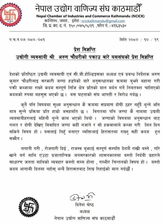 विज्ञप्ति जारी गर्दै संघले भनेको छ , ‘कुनै पनि विषयमा सुक्ष्म अनुसन्धान कै क्रममा सप्रमाण दोषी ठहर नहुँदै थुन्ने अनि मात्र सुन्ने प्रक्रिया प्रति हाम्रो असहमति छ । विगतमा पनि जग्गा कै नाममा उद्यमी व्यवसायीहरुलाई महिनौ थुन्ने काम भएको थियो । जग्गाको विषयमा अनुसन्धान बाट गलत र दोषी देखिए विवादित जग्गा कहीं नजाने र सो हकवालाले कब्जा गरी लिन दिन सकिने विषय हो । यसलाई निहुँ बनाएर व्यक्तिलाई हिरासतमा राख्नु सही कदम हुन सक्दैन ।’