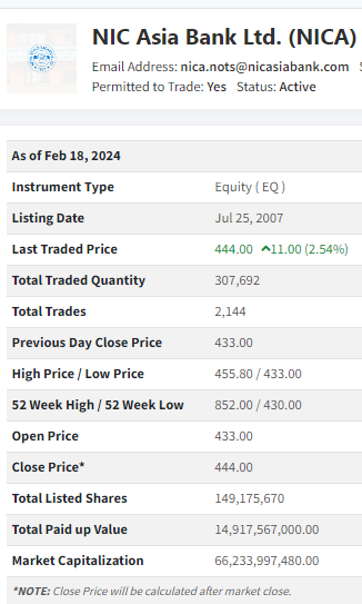 यस दिन एनआईसी एशियाको शेयर मुल्य ११ रुपैँयाले बढेको छ । गत हप्ता विहिबार एनआइसी एशियाको शेयर मूल्य ४३३ थियो भने यस दिन बढेर प्रतिशेयर ४४४ रुपैँया पुगेको हो । यसले एनआइसी यशियाको वित्तीय स्थिती मजबुत रहेको संकेत गर्दछ ।