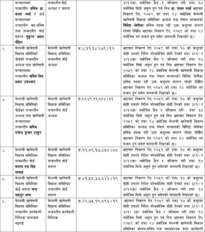 मेलम्ची खानेपानी विकास समितिका तत्कालीन कार्यकारी निर्देशक सूर्यराज कँडेलविरुद्ध ८९ करोड आठ लाख ९८ हजार दुई सय ८५, समितिका तत्कालीन उपसचिव मणिभद्र न्यौपानेविरुद्ध ३२ करोड ३५ लाख ६१ हजार छ सय ६३, लेखा अधिकृत रामचन्द्र न्यौपानेविरुद्ध ३२ करोड ३५ लाख ६१ हजार छ सय ६३ बराबरको बिगो दाबी गरिएको छ ।