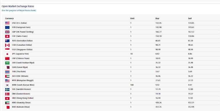 त्यस्तै युरो एकको खरिद दर १४२ रुपैयाँ ९८ पैसा र बिक्री दर १४३ रुपैयाँ ६३ पैसा पुगेको छ । बेलायती पाउण्ड एकको खरिद दर १६६ रुपैयाँ ७७ पैसा र बिक्री दर १६७ रुपैयाँ ५२ पैसा रहेको छ।