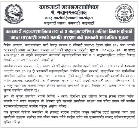 विशेष अदालतले फागुन ३ गते उक्त सरकारी सम्पत्ती जफत गरिएको फैसला गरेको थियो । महानगरले जफत गरिएको जग्गा सरकारी भएको भन्दै सात दिन भित्र उक्त क्षेत्रबाट हट्न निर्देशन दिएको हो ।