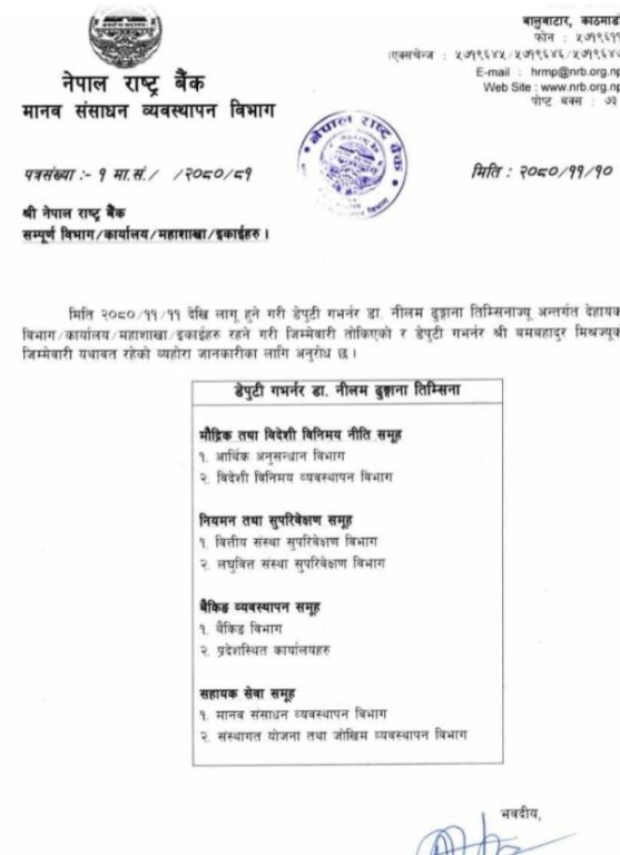 अर्का डेपुटी गभर्नर बम बहादुर मिश्रको जिम्मेवारी भने यथावत् राखिएको छ । ढुंगानालाई आर्थिक अनुसन्धान विभाग दिएर वाणिज्य बैंकहरुको सुपरिवेक्षण विभाग गर्भनर अधिकारीले आफनो मात्तहतमा राखेका छन् ।