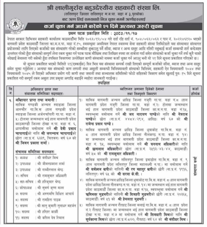 काठमाडौं – बागमती प्रदेशका पूर्वमुख्यमन्त्री राजेन्द्र प्रसाद पाण्डेलाई लालीगुरासँग सहकारीले ऋण तिर्न २१ दिने अल्टिमेटम दिएको छ। ललितपुरमा रहेको श्री लालीगुरासँग बहुदेश्यीय सहकारी संस्थाले पाण्डेको नाममा ऋण तिर्न आउने सुचना जारी गर्दै २१ दिने अल्टिमेटम समेत दिएको हाे ।