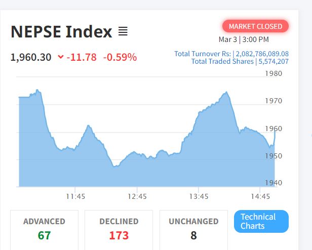 शेयर बजारमा ११ अंकको गिरावट, कारोबार रकम २ अर्बमा खुम्चियो