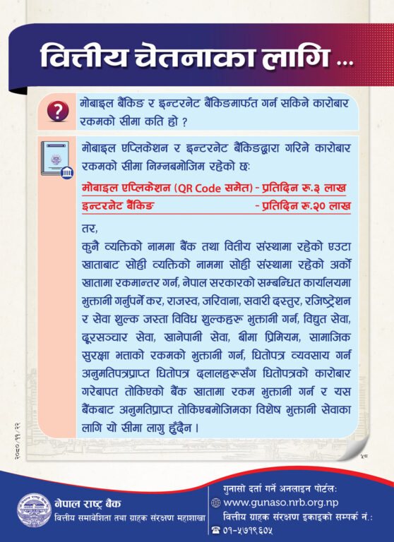 केन्दीय बैंकले मंगलबार एक सूचना मार्फत मोबाइल एप्लिकेशन (क्यूआर कोडसमेत) प्रतिदिन ३ लाख र इन्टरनेट बैंकिङ्गको माध्यमबाट प्रतिदिन २० लाख रुपैयाँको कारोबार गर्ने सकिने जनाएको हो ।