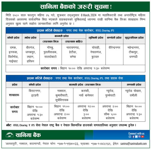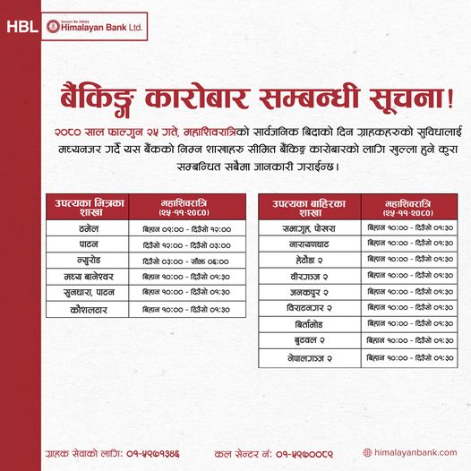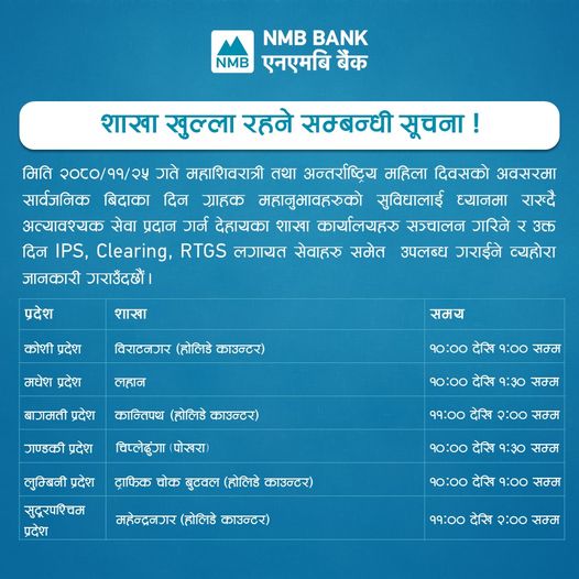 आफ्ना ग्राहकहरुको आवश्यकतालाई मध्यनजर गर्दै अधिकांश वाणिज्य बैंक र विकास बैंकहरुले बैैंकिङ्ग सेवा प्रदान गरिरहेका हुन् । सम्पूर्ण शाखा संचालन नगरेपनि केहि शाखा मार्फत बैंकहरुले बिदाका दिन समेत सेवा प्रदान गरिहेका छन्।