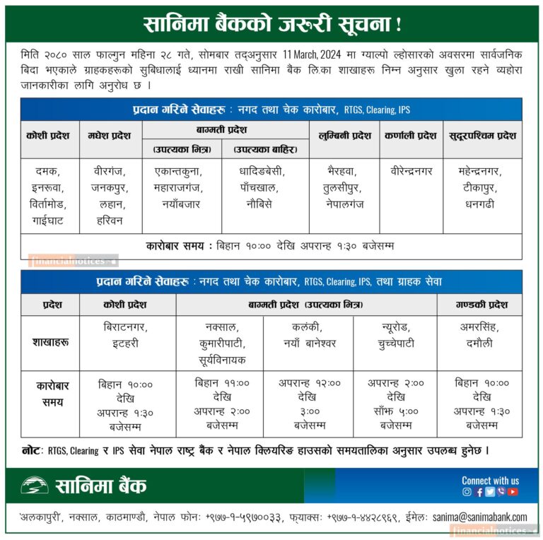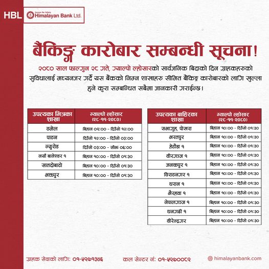 सम्पूर्ण शाखा संचालन नगरेपनि केहि शाखा मार्फत बैंकहरुले आज सार्वजनिक बिदाकाे दिन पनि सेवा दिइरहेका छन् ।